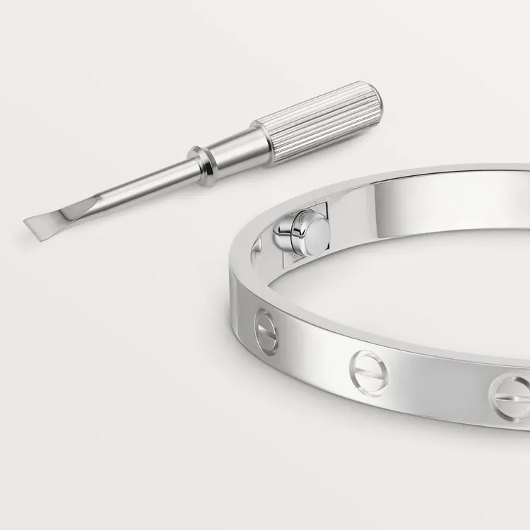 LOVE bracelet, white gold (750/1000). Comes with a screwdriver. Width: 6.1 mm. Created in New York in 1969, the LOVE bracelet is an icon of jewelry design: a close fitting, oval bracelet composed of two rigid arcs which is worn on the wrist and removed using a specific screwdriver. The closure is designed with two functional screws placed on either side of the bracelet: you will need help to open or close it. To determine the size of your LOVE bracelet, measure your wrist, adding one centimeter to your size for a tighter fit, or two centimeters for a looser fit.