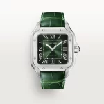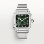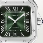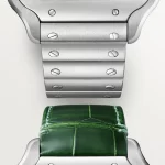 Santos de Cartier watch, large model, mechanical movement with automatic winding 1847 MC. Steel case, 7-sided crown set with a synthetic faceted blue spinel, graduated green dial, polished steel sword-shaped hands with luminescent material, sapphire crystal. Steel bracelet with SmartLink adjustment system. Second strap in green alligator skin, with interchangeable steel folding buckle. Both are fitted with the QuickSwitch interchangeable system. Case width: 39.8 mm, thickness: 9.38 mm. Water-resistant up to 10 bar (approx. 100 meters/330 feet).
