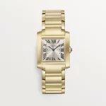 Tank Française watch, medium model, quartz movement. Case in 18K yellow gold (750/1000). Faceted crown in 18K yellow gold 750/1000 decorated with a sapphire cabochon. Golden sunray dial, blued-steel sword-shaped hands, sapphire crystal. Bracelet in 18K yellow gold (750/1000). Dimensions: 32 mm x 27 mm, thickness: 7.1 mm. water-resistant to 3 bar (approx. 30 meters/100 feet).