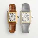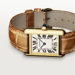 Tank Louis Cartier watch, small model, quartz movement. 18K yellow gold (750/1000) case, beaded crown set with a sapphire cabochon, silver-grained dial, blued-steel sword-shaped hands, mineral crystal, alligator-skin strap 18K yellow gold (750/1000) ardillon buckle. Case dimensions: 29.5 mm x 22 mm, thickness: 6.35 mm. Water-resistant up to 3 bar (30 meters/100 feet).