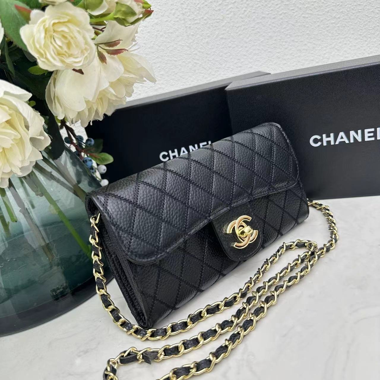 Home BAGS CHANEL Chanel chain crossbody bag diamond and litchi cowhide Black 50098 size: 19*10*3.5㎝