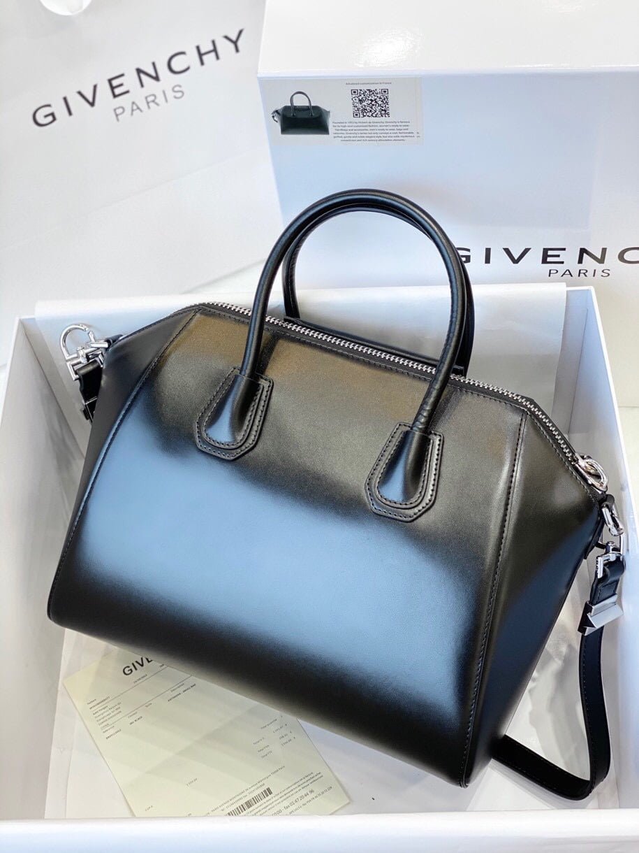 Top original single Givenchy antigona bare leather tote with top zipper with two handles on top front logo sticker removable shoulder strap Silver hardware accessory built-in zipper pocket.