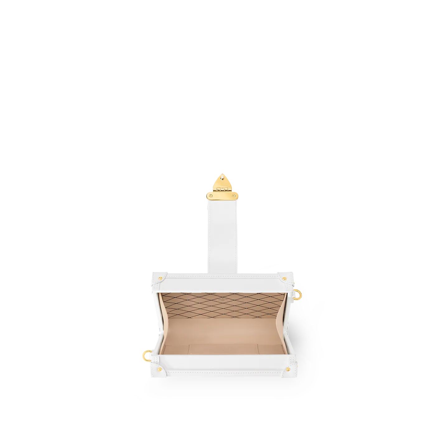 The Petite Malle Tricolore is made from white lambskin with a Monogram in red, white, and blue, the colors of the French flag. The gold-color S-lock and clasps and white cowhide-leather trim complete Nicolas Ghesquière’s celebration of the House’s French heritage. It can be carried like a clutch or with its removable and adjustable strap.